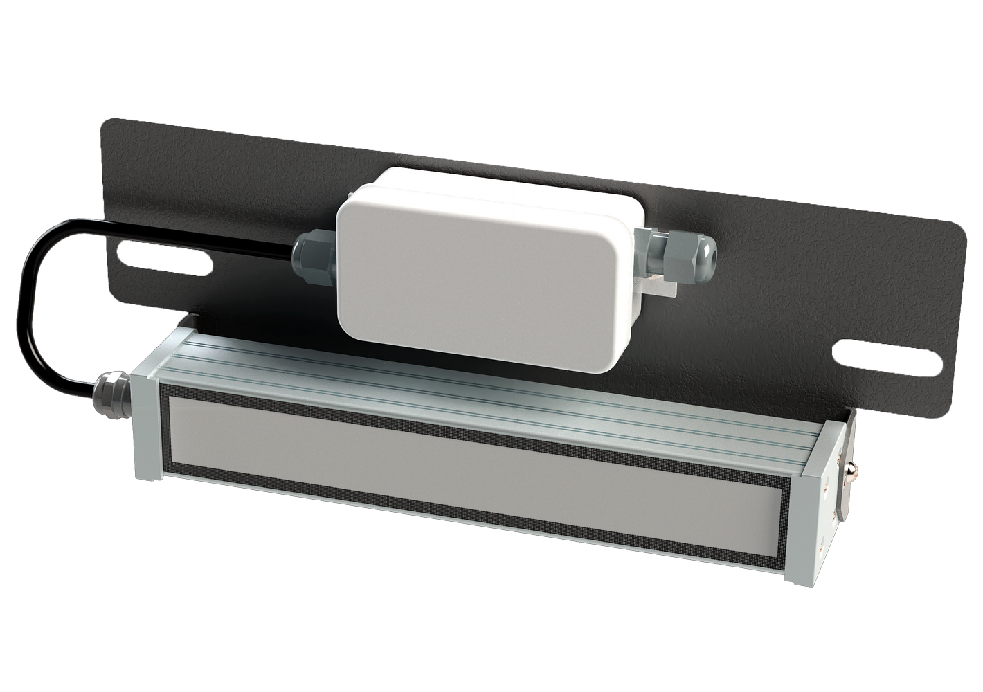 The lamp has a rectangular aluminum housing made from a special profile. On the front side of the profile, there is a protective grille that shields the lamp's glass