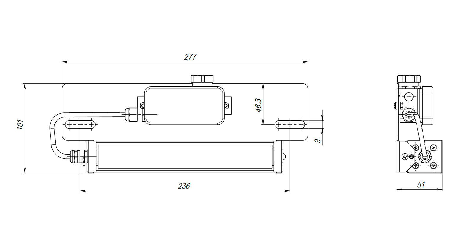 A white LED indicator module is inserted into the housing. A cable gland is installed on the side wall of the lamp to seal the interior space. Inside the lamp's profile cavity, an LED power converter is installed