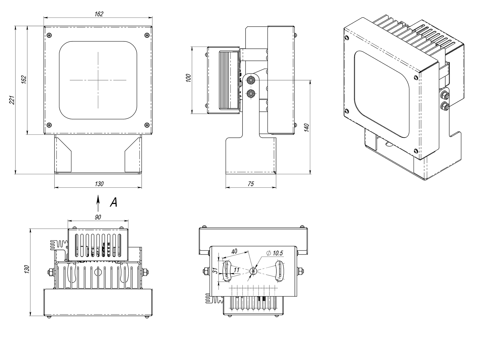 The display modules with LEDs and focusing lenses installed on them are attached to aluminum radiator plates, the back of which has fins. At the front, the lenses are covered by a mask with polycarbonate glass for protection during installation and operation. At the bottom of the projector bracket, the power source of the projector is fixed, covered by a protective cover. On the side of the casing, in the holes, there are removable connectors for connecting to the electrical circuit of the locomotive and for powering the floodlight LEDs