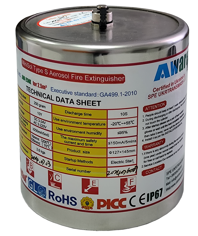 The aerosol mixture is based on a common substance — potassium carbonate K₂CO₃ (potash), under the action of which a flow of mixed gases and solid particles is generated. Extinguishing occurs due to the interruption of chain reactions at the epicenter of the fire
