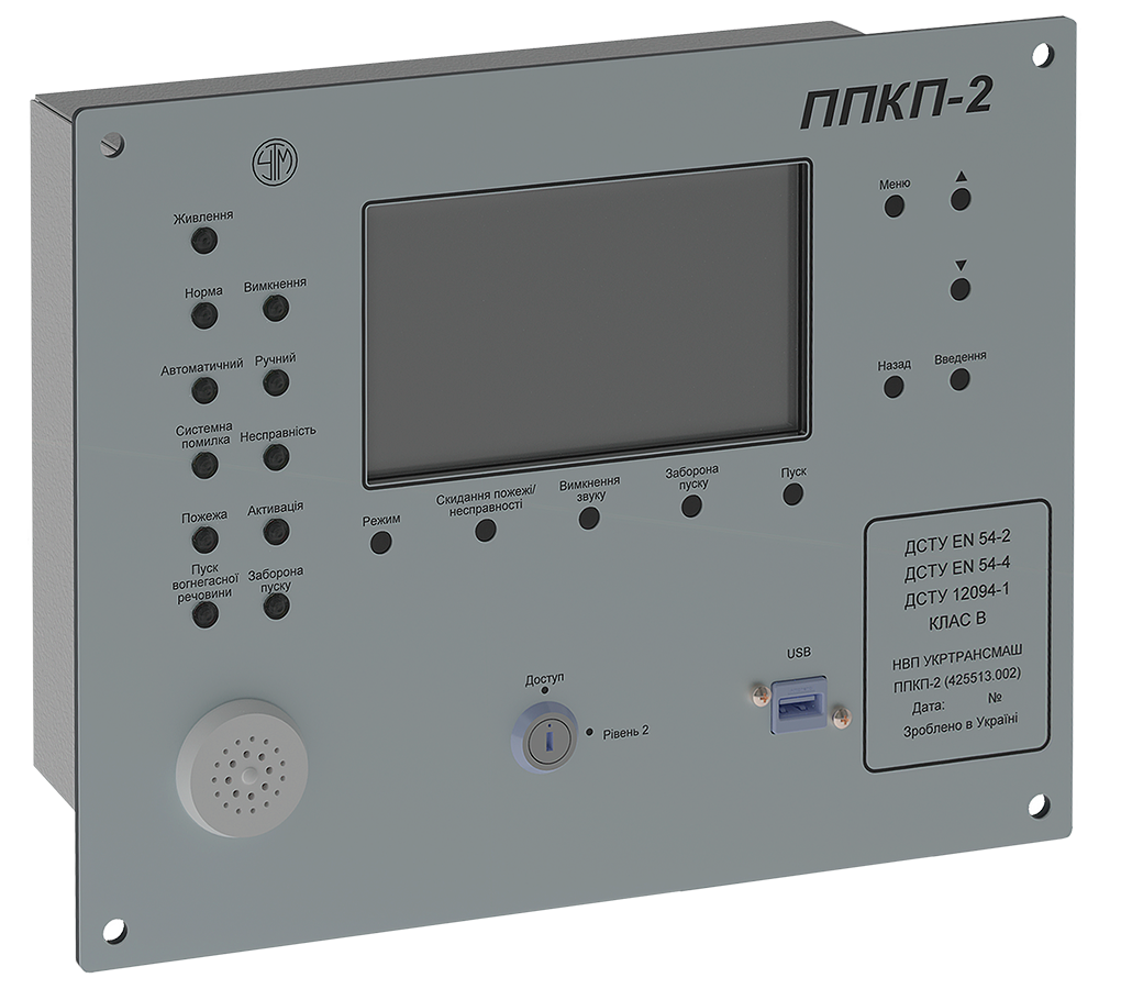 The PPKP-2 unit is designed to display the system status, receive information about the condition of fire loops from the BAP-1 unit, issue commands to the BAP-1 unit, and execute the fire extinguishing algorithm. The front panel of the PPKP-2 features indicators – LED lights, a graphic display, control elements – buttons, and an audible alarm. The software of the PPKP-2 control and monitoring device provides automatic and manual operation modes